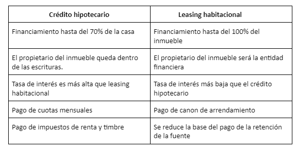 - El leasing habitacional se hace entre una Entidad financiera y una persona natural: no se puede hacer entre 2 personas naturales.